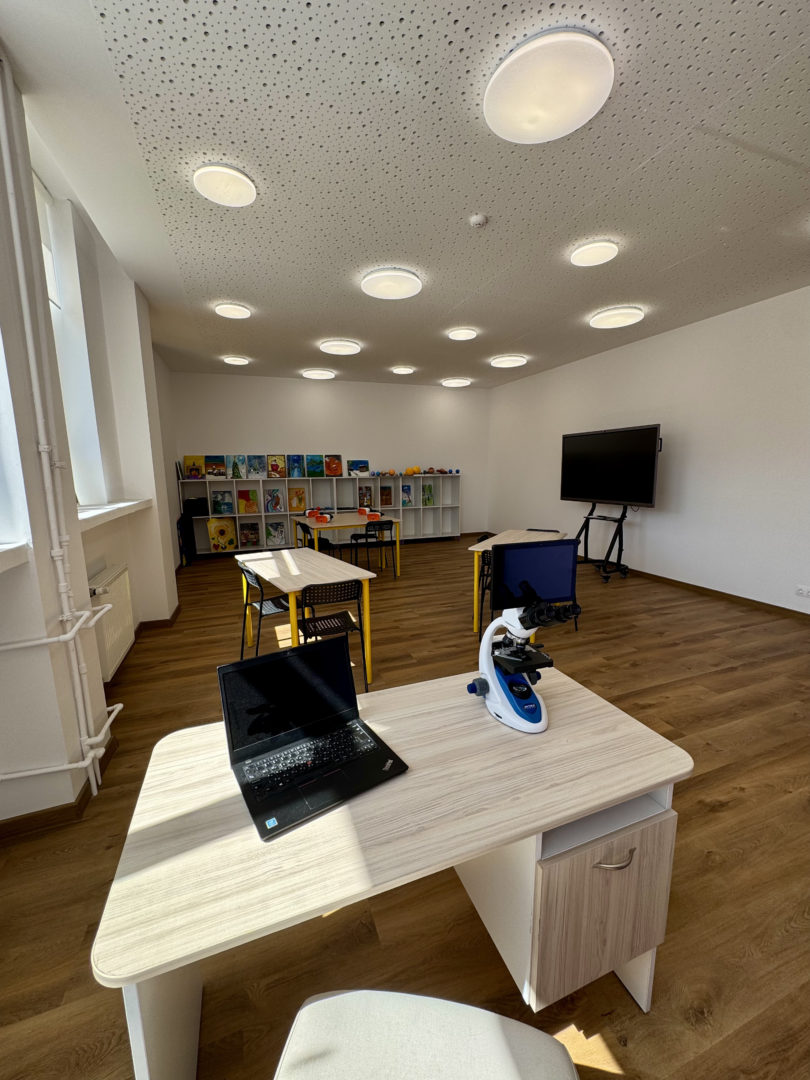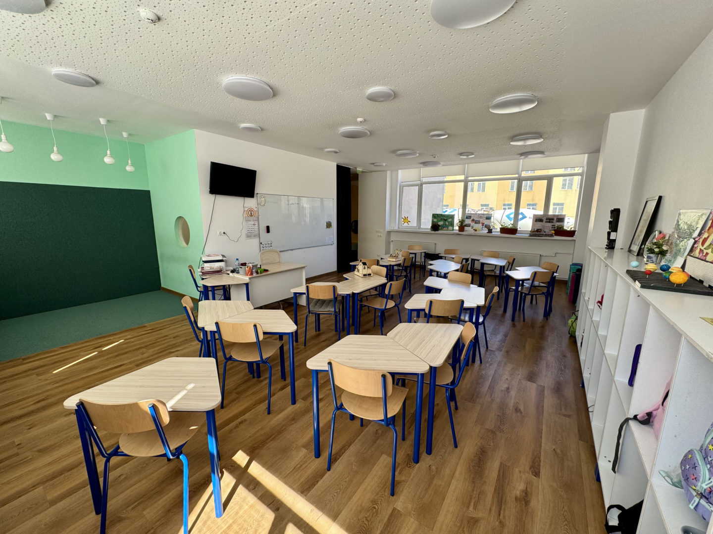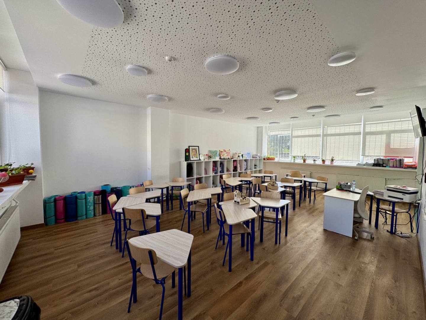 - Настилки: Използвана е високоиздръжлива хибридна дървена настилка (SPC сърцевина, клас на износоустойчивост 33/42) и мокет на ролка (клас 33: heavy commercial use) в учебните зони. В Творителницата е положена саморазливна настилка в два цвята (единият маркира сцената).