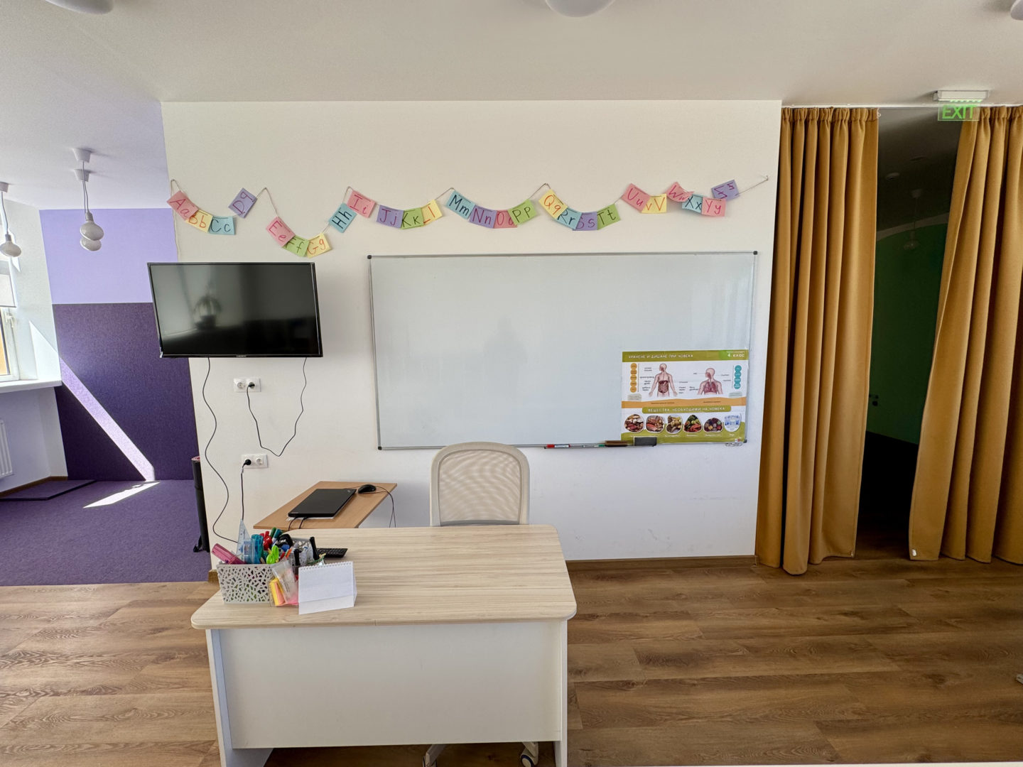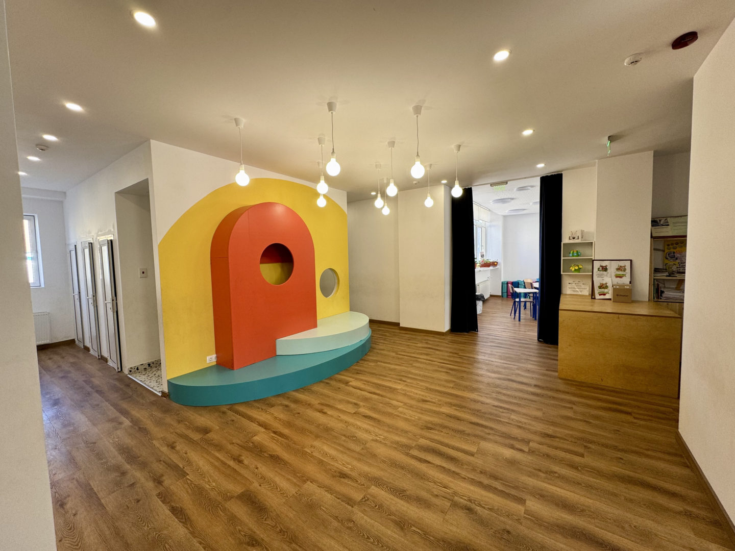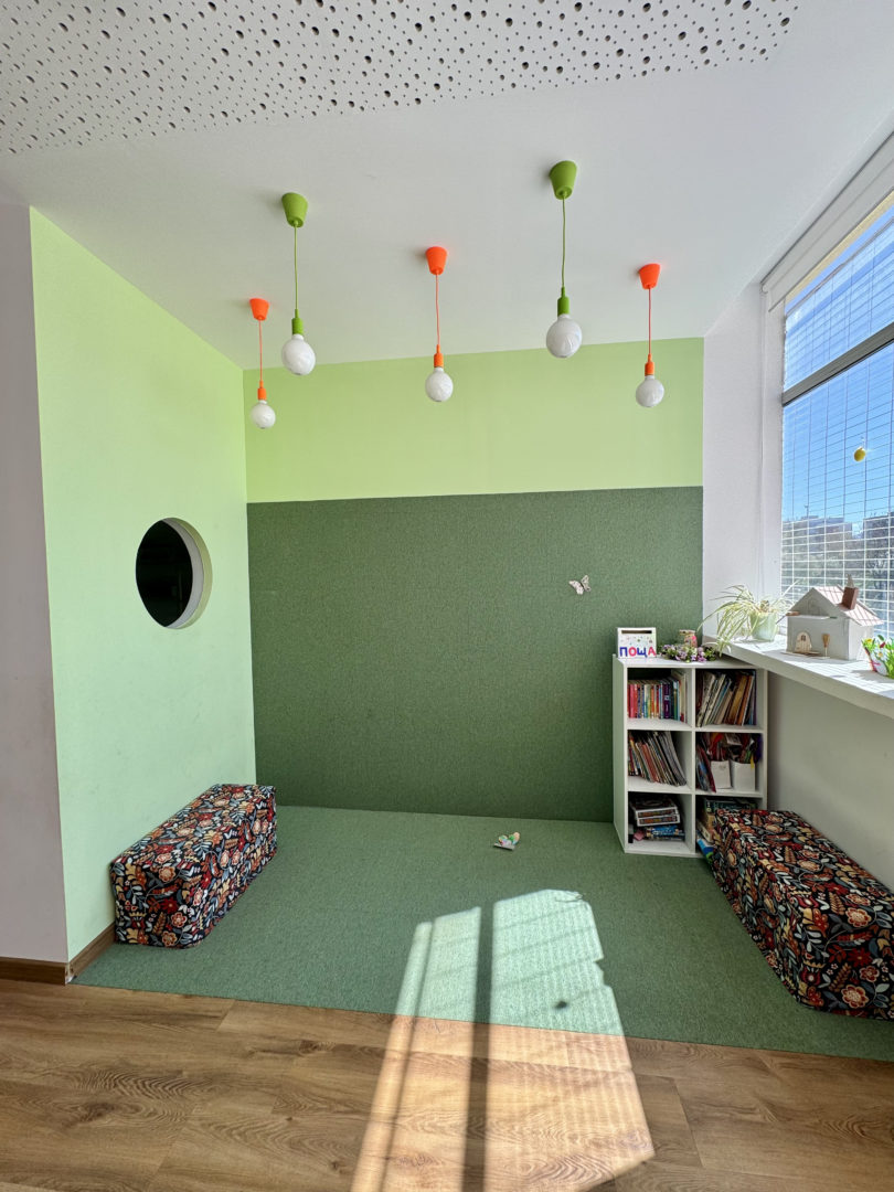 - Капацитет: Максималният капацитет на еднопространствената зона с двете студия е 52 души (48 деца и 4 учители).