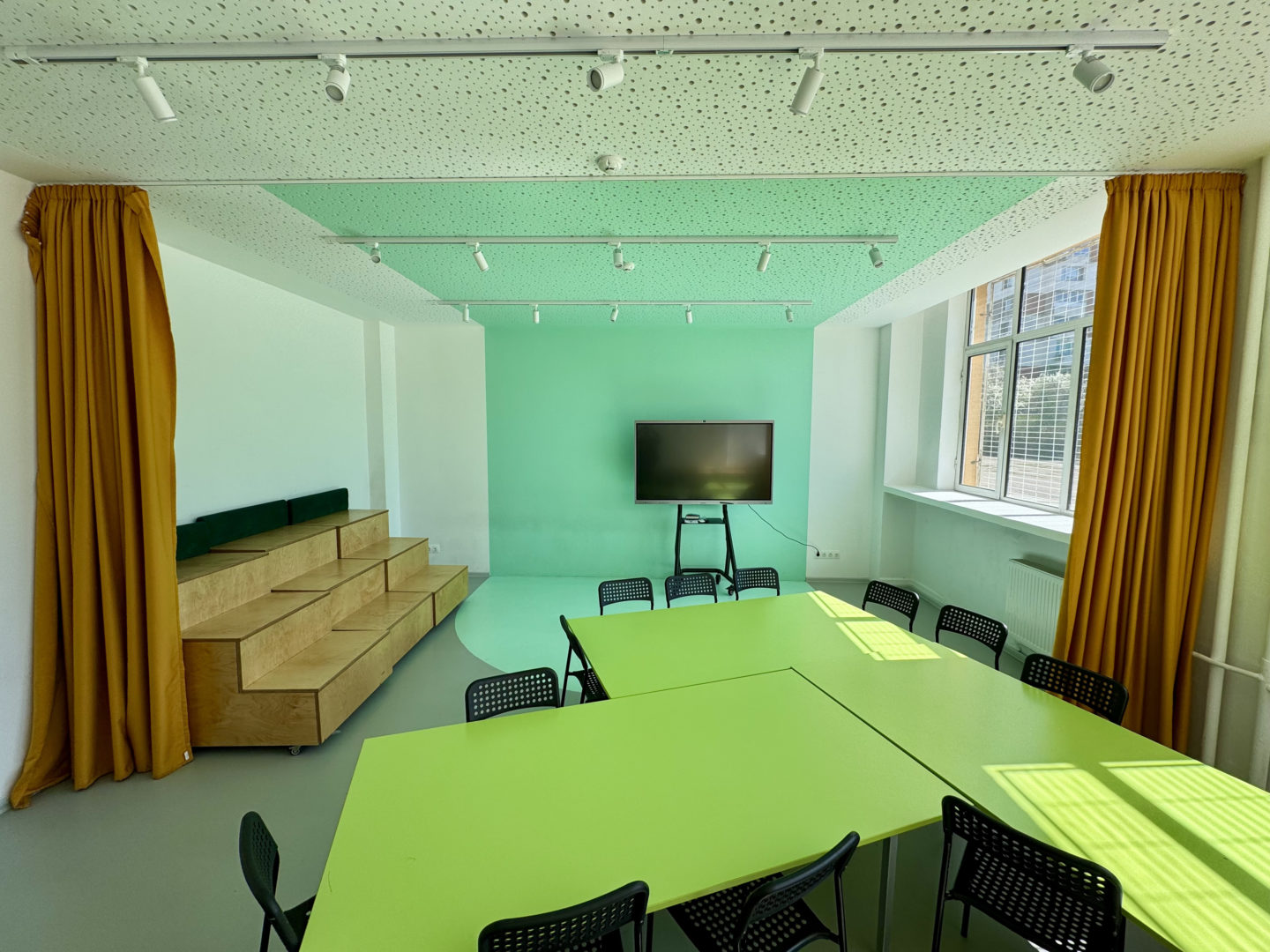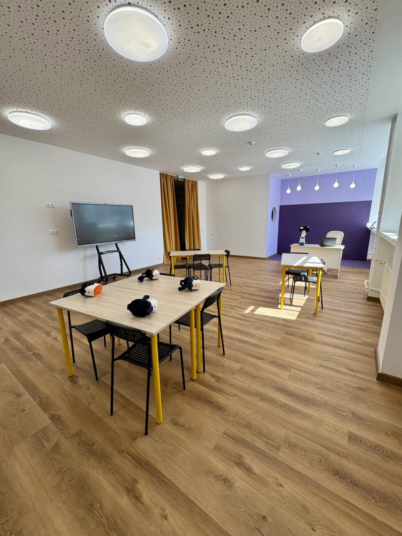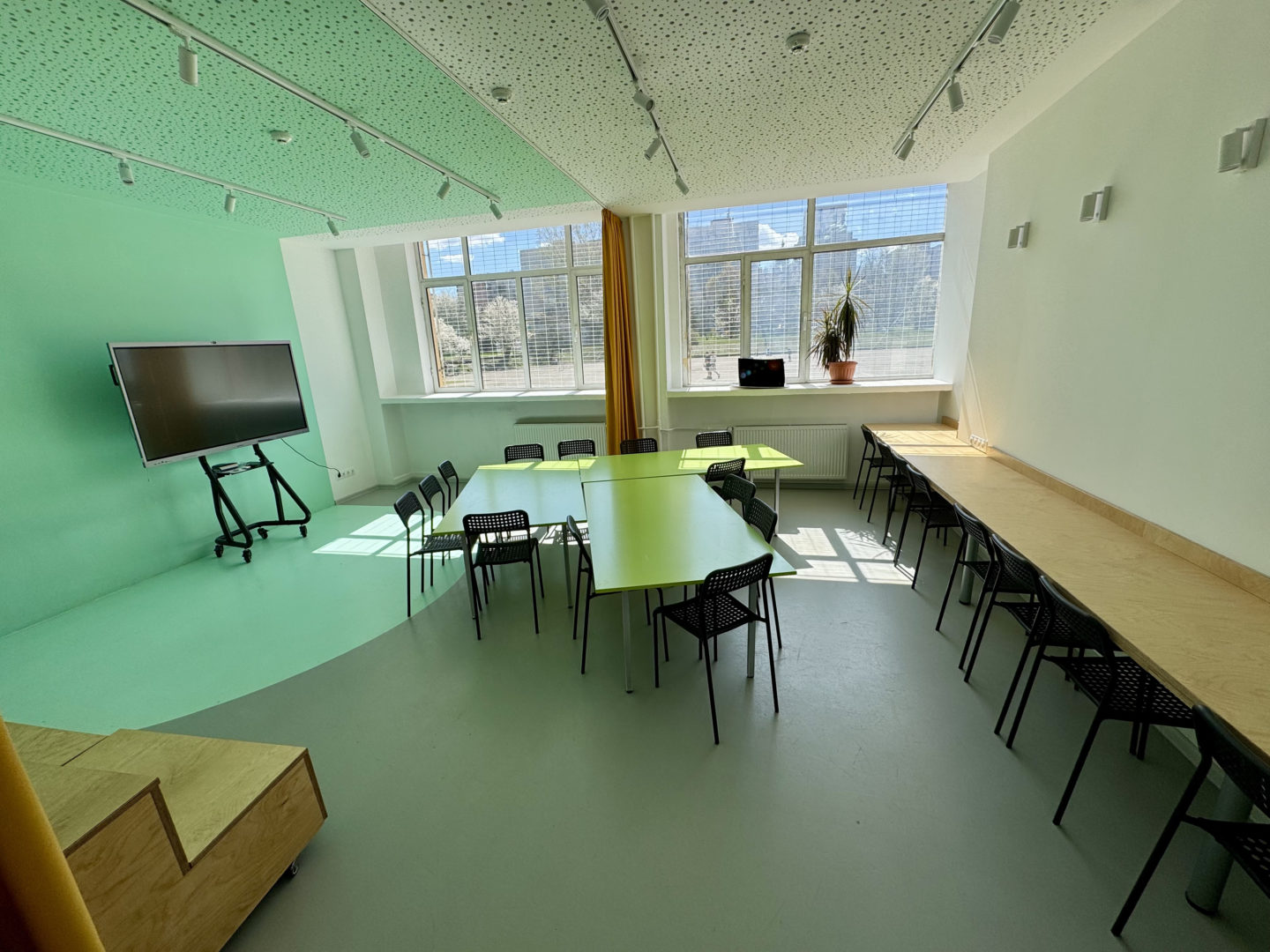 - Гъвкави мебели: Масите в учебните студия са с форма на трапец за разнообразно подреждане.